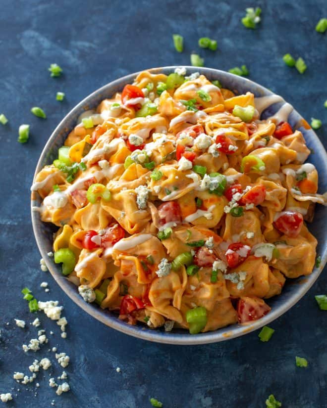 This Buffalo Chicken Tortellini Salad is a pasta salad with chicken, celery, tomatoes, and green onions with a ranch and buffalo dressing. Add some blue cheese crumbles if that’s your thing. You’ll love this spicy pasta salad made with Buitoni!