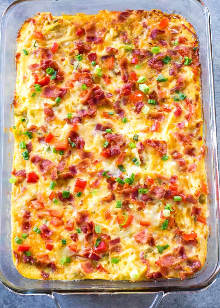 Confetti Bacon Hashbrown Casserole is a great breakfast for entertaining filled with cheesy hashbrowns, eggs, chiles, green onions, and red bell pepper.