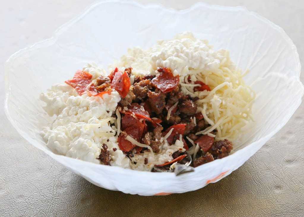 In a medium bowl, combine sausage, pepperoni, cottage cheese, Italian seasonings, and 1 cup of the mozzarella cheese.
