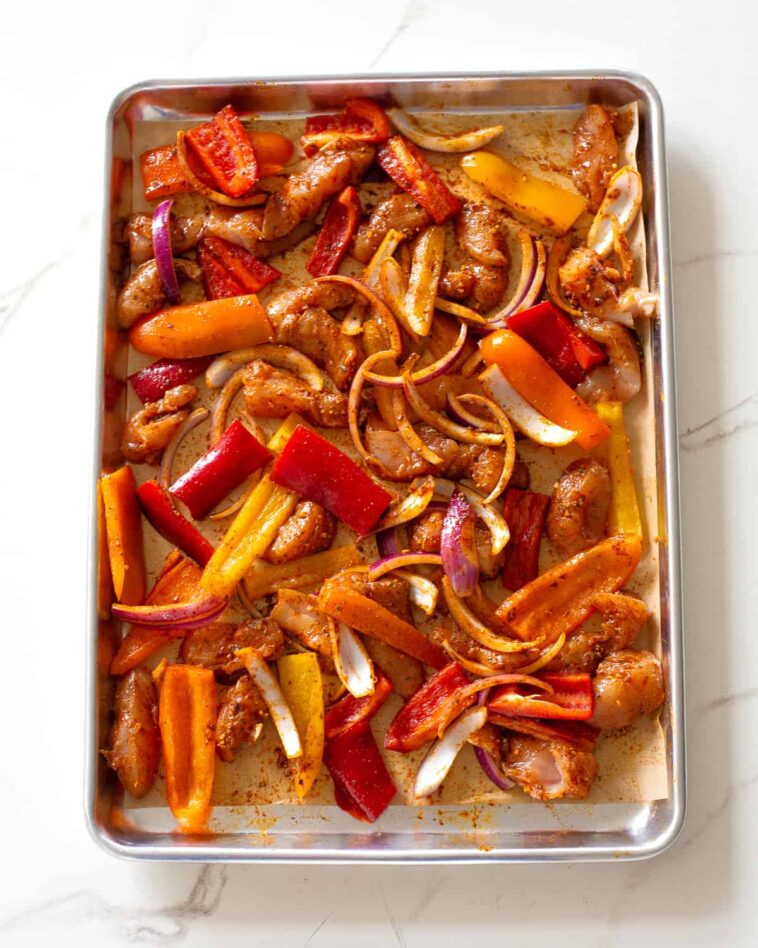In a large bowl, add the chicken, bell peppers, and onion. In a small bowl, combine the olive oil, lime juice, seasonings, and garlic. Pour over chicken mixture and toss to coat. Note: You can also just mix everything on the pan to make it truly a one-pan meal.