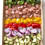Add the asparagus to the baking sheet and drizzle with olive oil. Toss to coat and season with salt and pepper. Move to the sides of the pan.