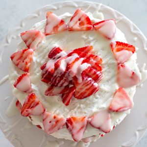 Place one of the glazed cake rounds on a cake stand or large plate. Top with freshly whipped cream and a layer of strawberry slices. Follow with the second cake, more whipped cream and arrange more fresh sliced strawberries on top in a pretty pattern. Next drizzle the more of the almond glaze over the top and down the sides. Store in fridge until ready to serve. We like it chilled!